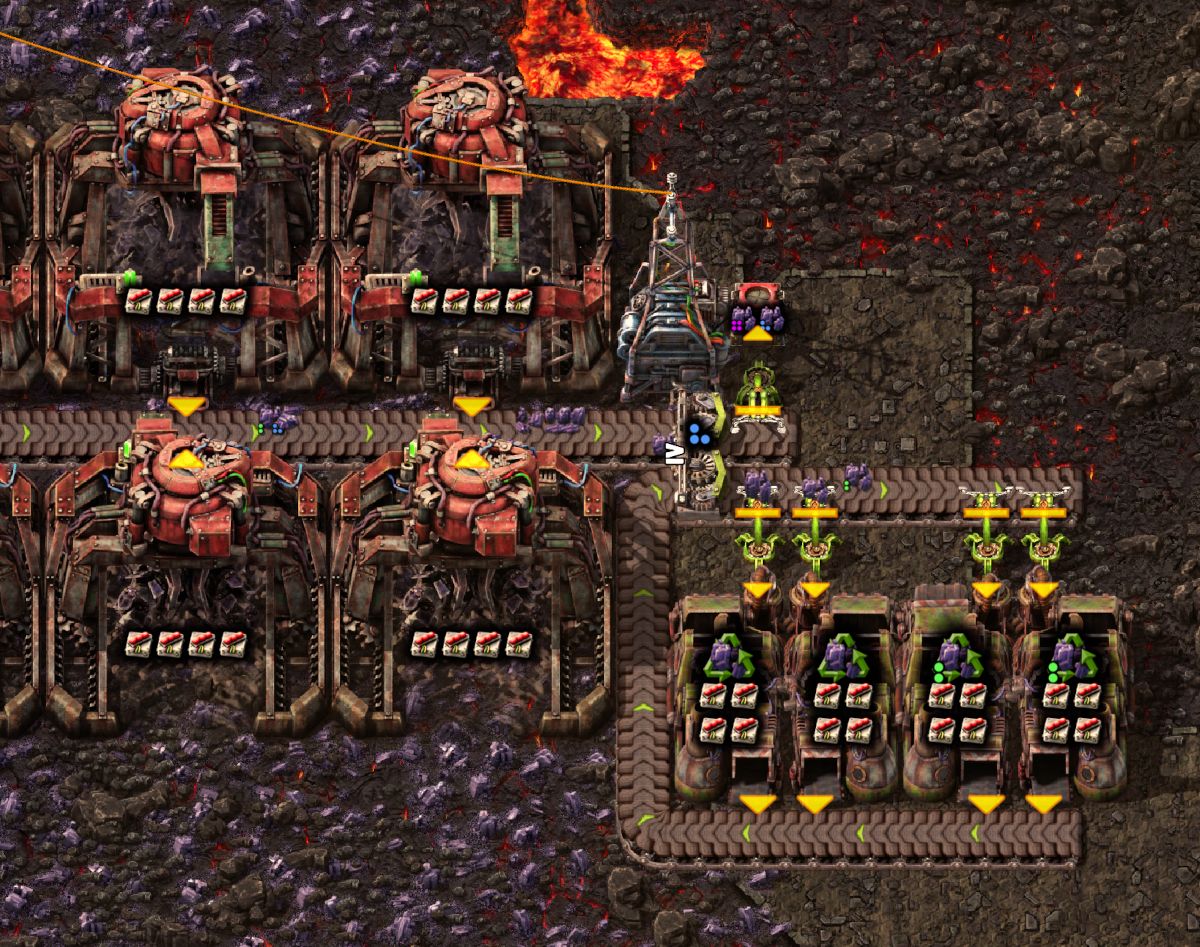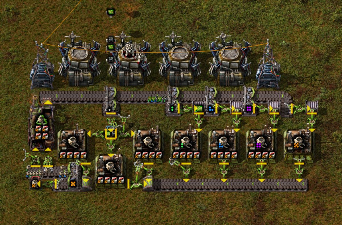 As “technologies” are unlocked in-game, Factorio offers many mechanisms to improve production. One of them is modules: crafting machines have a (limited) number of slots to accept different kinds of modules that affect their stats: speed modules make the machine run faster at the cost of more energy consumption, productivity modules increase yield from the same ingredients at the cost of speed and energy, etc.