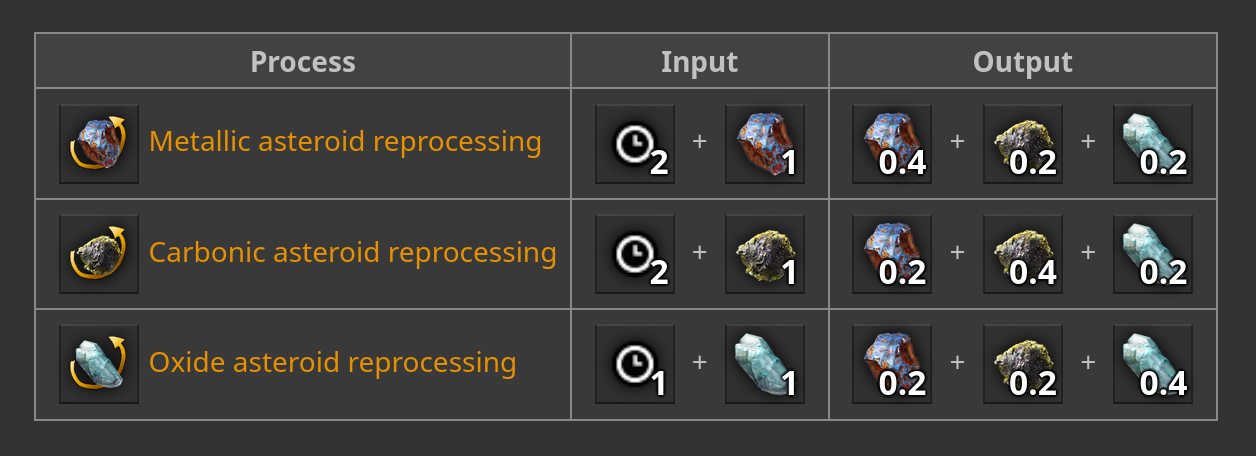 - When extracting a single type of legendary asteroids, the legendary yield is about of the total fresh input. This is much better than about for “washing” a.k.a. pure recycling, thanks to reprocessing destroying its input only 20% of the time v.s. 75% for recycling.