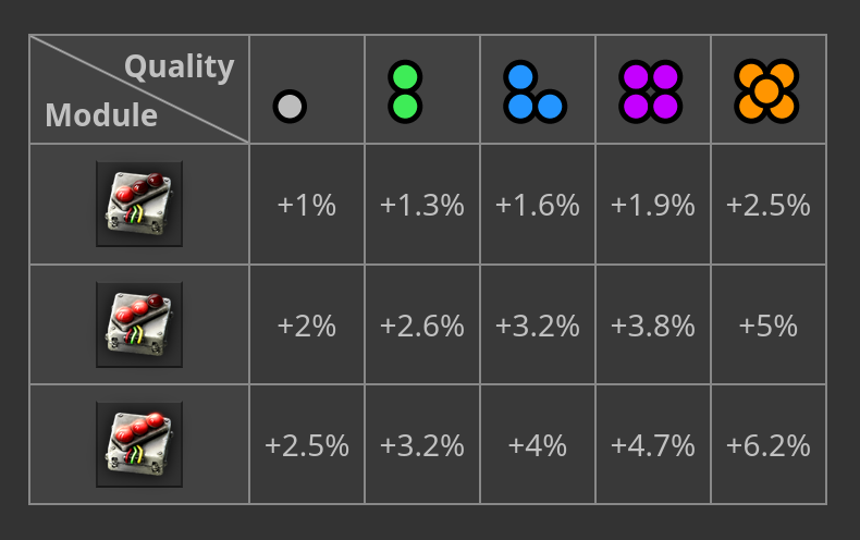 For example, the maximum possible quality chance in a machine with four module slots is 24.8%: