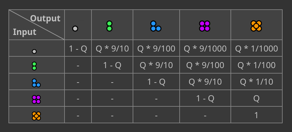 Let’s consider one item injected into the system, in this case from mining, and call the 5-component row vector of probabilities of each quality tier.